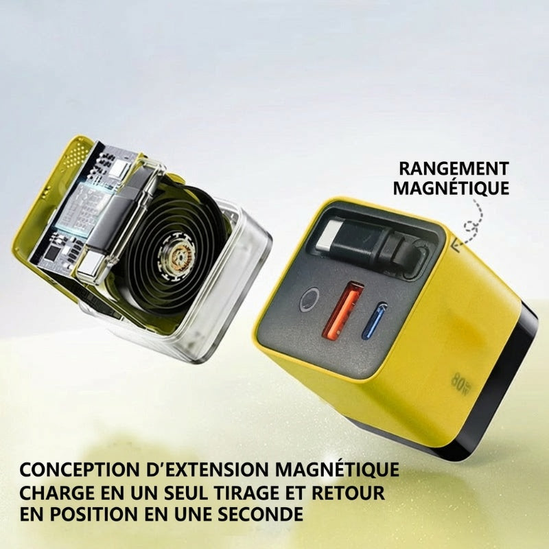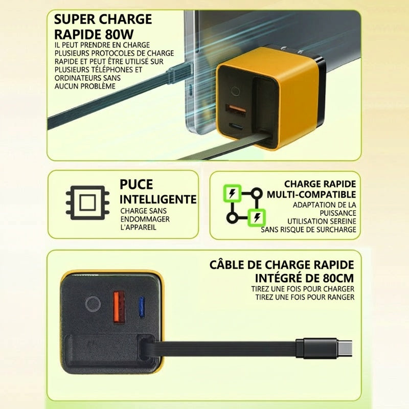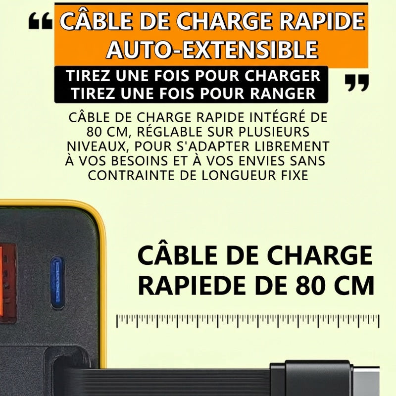 Chargeur secteur 80 W à charge rapide avec câble USB-C rétractable de 80 cm
