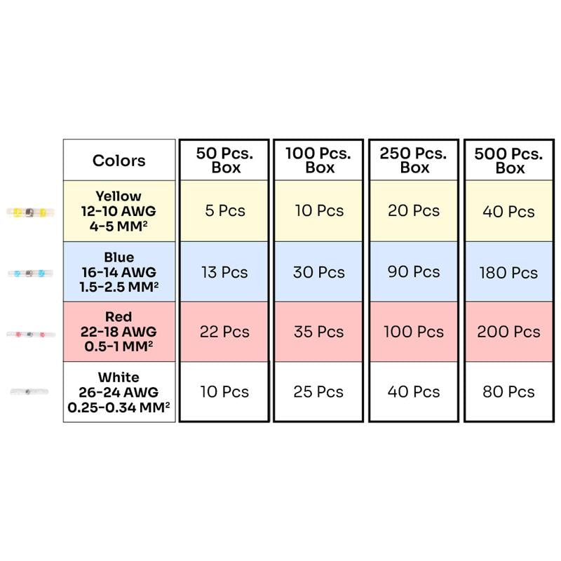 Les tubes à code couleur permettent d'identifier facilement la taille de connecteur adaptée à chaque application. Mesurez votre fil et choisissez facilement le bon connecteur en consultant le tableau des tailles de fil sur la boîte.